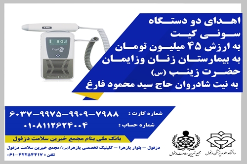 مدیرعامل مجمع خیرین سلامت دزفول اعلام کرد: دو دستگاه سونی کیت به ارزش ۴۵ میلیون تومان به نیت شادروان آقای حاج سیدمحمود فارغ به بیمارستان زنان و زایمان حضرت زینب (س) اهدا شد