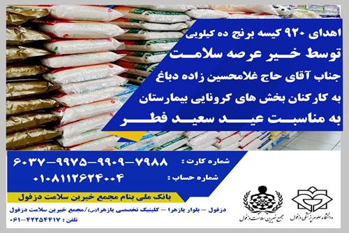 مدیرعامل مجمع خیرین سلامت دزفول گفت: یکی از خیرین سلامت دزفول، ۹۲۰ کیسه برنج ۱۰ کیلوگرمی وارداتی به ارزش یک میلیارد و ۵۰۰ میلیون ریال تهیه و بین پرسنل و نیروهای خدماتی بخش کرونای بیمارستان بزرگ این شهرستان توزیع کرد.