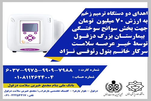 مدیرعامل مجمع خیرین سلامت دزفول بیان نمود: یکی از مهمترین دستگاه های بخش سوانح سوختگی که در آینده نزدیک به بهره برداری خواهد رسید دستگاه وکیوم تراپی زخم است.